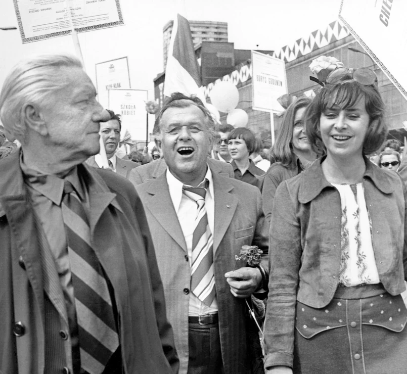 1/10 Pochód w 1975 r. w Warszawie. Warszawa 01.05.1975. Święto Pracy. Pochód pierwszomajowy na ulicy Marszałkowskiej. Na zdjęciu: m.in. aktorzy Teatru Polskiego w Warszawie - Wacław Kowalski i Jolanta Bohdal